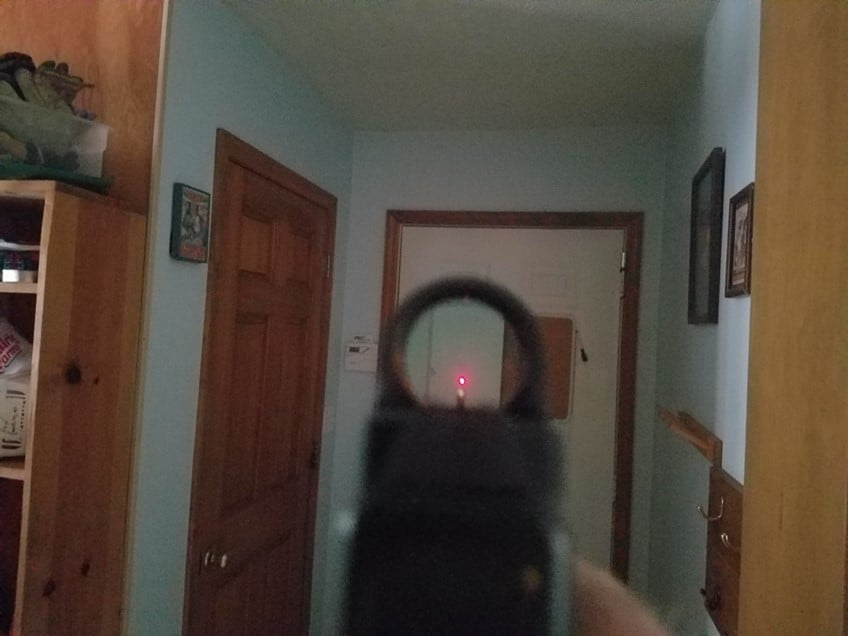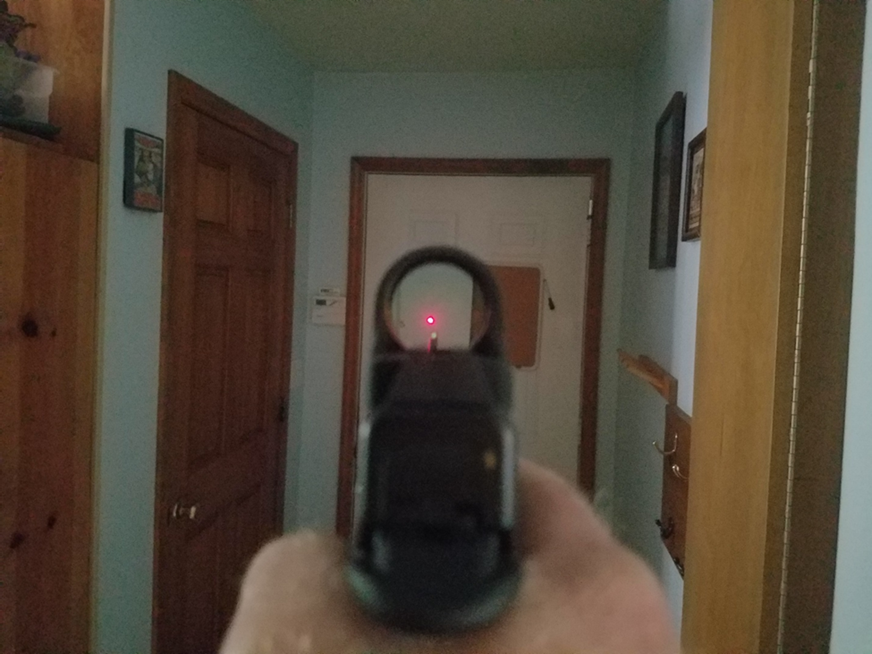 Photo 2 – Closer view; note that the rear sight is blurry, while the red dot and target (door, 12 feet away) are clearly in focus. The green tritium-tipped front sight is slightly blurry. A key advantage of MRDOs is allowing the shooter to maintain focus on the target, without needing to transition focus back to the front sight before shooting. Improved speed and accuracy is the result.