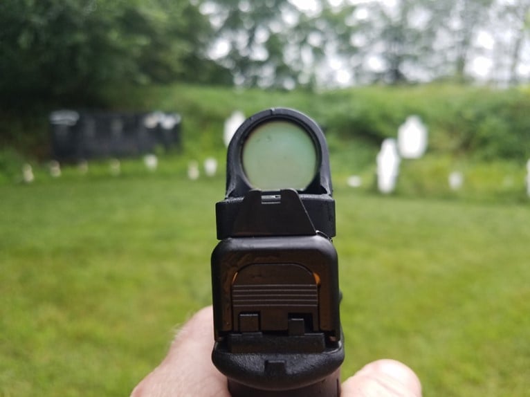Just the other week, it was 95 degrees outside with 95 percent humidity. I had my Glock 34 with the SRO MRDO inside my house, with the air conditioner set at 74 degrees. I strapped on my gun belt and walked out to the shooting range (yes, I live in the country, and can shoot where I live). After making sure the range was safe, I loaded up and prepared to engage my targets. Something was wrong. My sight was fuzzy white, and I could not see the red dot. What was the problem? Condensation. The cold glass optics, in the humid warm weather, developed a layer of condensation that obscured the dot. My answer to the problem: I used my shirt (clean, cotton) to quickly wipe off the moisture with a quick 2 second motion, and then fired, accurately striking the target. Of note, in a gunfight that two-second delay could mean you are dead. My experienced colleague Dr. Brian Springer suggests the following: use an anti-fog spray like Cat Crap, available on Amazon. Practice alternative sighting methods such as guillotine and shoulder framing, that use the outline of the optic itself to create a rough sight picture. Do yourself a favor and take a reputable pistol-mounted optics class that addresses these concerns.