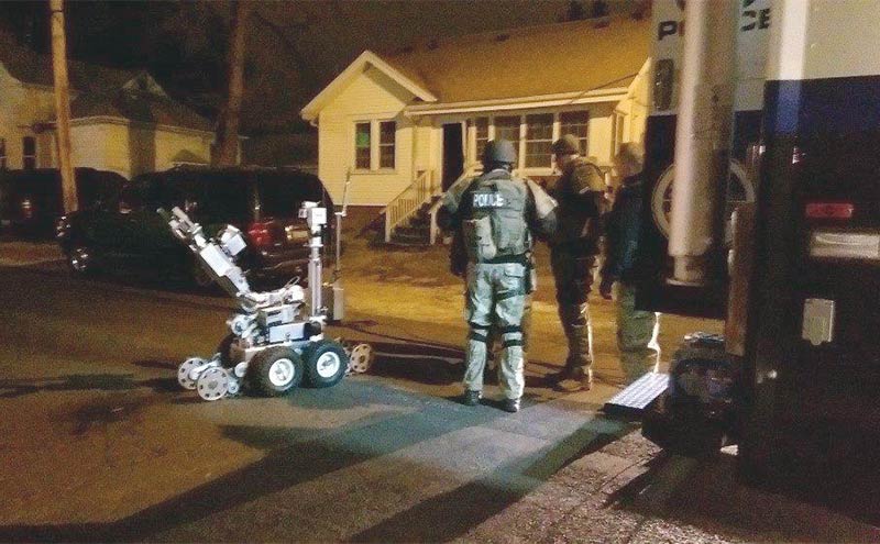 Over the course of several hours, police negotiators used loudspeakers to try to talk the suspects into walking out with their hands in the air, and surrender. No success. Decisions were made to deploy the robot to deliver a telephone to the house, with hopes that direct contact via telephone with negotiators would be more successful. These photographs show the robot being utilized. The robot was escorted approximately 150 yards down an alley to the house, where tactical officers had surrounded and contained the inner perimeter. A phone was delivered to the door of the house and one suspect stepped out to get the phone. Communication was effective.