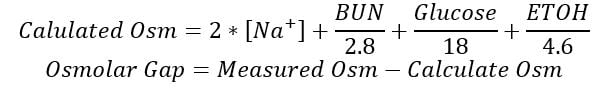 A normal osmolar gap is between -14 to +10 mOsm/L [18]. Toxic alcohols should be on your differential in the setting of an abnormal positive osmolar gap. It is important to realize that the lack of an osmolar gap does not preclude a toxic alcohol ingestion. This is due to the wide variability in “normal” osmolar gaps in the population and metabolism of toxic alcohols. There are numerous equations that are used to calculate the osmolar gap and each has its own reference range and there is individual variability. What could be normal in one person, may be indication of a toxic alcohol ingestion. Later in the time course of a toxic alcohol ingestion, patients will often have normal osmolar gaps as the original toxic alcohol has already been fully metabolized. This can be falsely reassuring and should not be used to rule out a toxic alcohol[19].