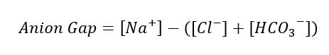 Shortly after ingestion, a patient will have a normal anion gap, as little toxic alcohol has been metabolized and there is very little organic acid present. As metabolism continues and the serum concentration of organic acids increases, the anion gap will also increase. Bicarbonate acts as a buffer in serum and will decrease in response to an increase in acid load. In the case of toxic alcohols, the organic acid metabolites are buffered initially by the bicarbonate in the serum. The reduction in bicarbonate concentration represents the increase in unmeasured organic acids. The unaccounted anions are formate in methanol and glycolate/glyoxylate/oxalate in ethylene glycol. A normal anion gap typically is < 12 mEq/L. Toxic alcohols should higher on the differential for patients who have an unexplained anion gap metabolic acidosis, even in the setting of a normal osmolar gap. The anion gap is calculated as follows.