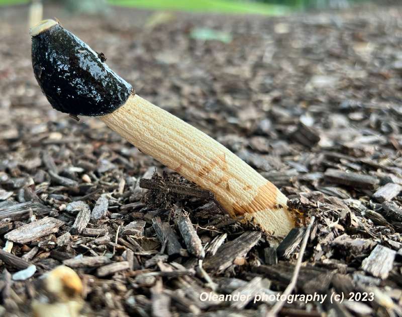 Image 1: “Stinky Horn with cup”. Notice the black slime covered cap, the latticed stipe, and the egg releasing the engorged carpophore (which includes the stipe (stem) the gills and the cap)