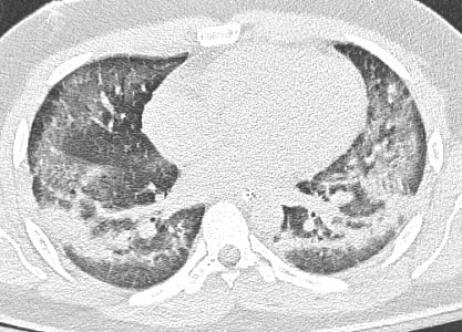 A 22 year-old male with a past medical history of moderate persistent asthma and anxiety disorder was found lying face down outside by his parents at home. Parents took him to primary care physician the next day and was prescribed 60 mg of prednisone. Patient showed worsening symptoms and presented to the emergency department with dyspnea and nonproductive cough the next day. Labs, imaging, and vitals revealed: WBC 12.8, temperature of 101.7 F, and chest x-ray showed increasing bilateral infiltrates. Patient was treated empirically for community-acquired pneumonia with ceftriaxone and azithromycin, and asthma exacerbation with prednisolone. Clinical worsening ensued, with the patient progressing from needing high flow nasal cannula to being intubated for hypoxic respiratory failure four days after onset of symptoms. Patient was transferred to a tertiary institution for suspected ARDS. On Day 1 of hospitalization, patient had coffee ground emesis on OGT suction 170ml, was put on pantoprazole 40mg po BID and closely monitored for upper gastrointestinal bleed/melena. On day 2 of hospitalization, chest CT showed diffuse bilateral ground glass opacities with peripheral sparing in all lobes of both lungs (Figure 1). Respiratory viral panel and urine legionella Ag screening were negative. Procalcitonin was within normal limits. Laboratory results were significant for a white blood cell count of 16.7. Antibiotic coverage was increased to vancomycin/piperacillin and tazobactam due to the development of a low-grade fever on day 4 of hospitalization. Bronchial alveolar lavage from right upper and middle lobe on day 4 of hospitalization was negative for malignant cells, thin prep slide showed few alveolar macrophages and benign bronchial epithelial and squamous cells.