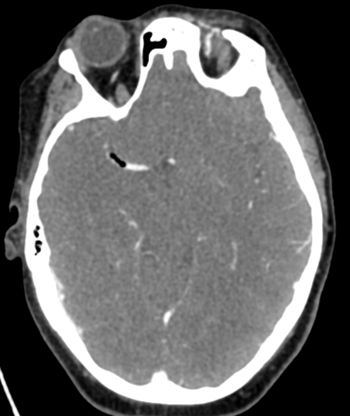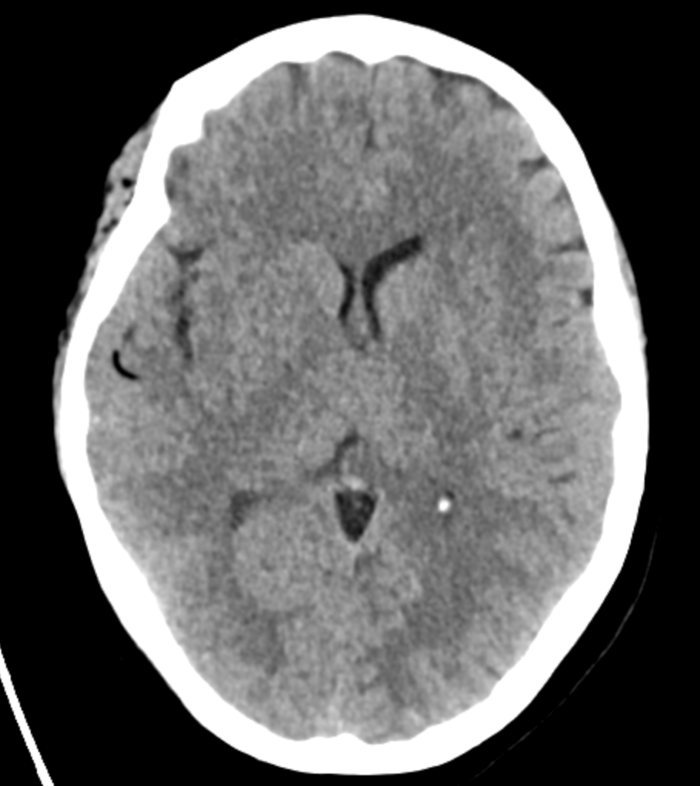 Initial objective data included T 37C, HR 85, RR 20, BP 153/109, spO2 98%. Glucose 102. Basic labs obtained and were unremarkable. Patient was rapidly taken to CT for stroke imaging. No contraindications to thrombolytics were identified. At 1708, noncontrast head CT showed no hemorrhage, but an abnormal hypodensity along the right middle cerebral artery concerning for an air embolus was visualized. CT angiogram head and neck was also suggestive of air embolus and CT perfusion brain demonstrated 27 mL of critical hypoperfusion at the right posterior middle cerebral artery distribution.
