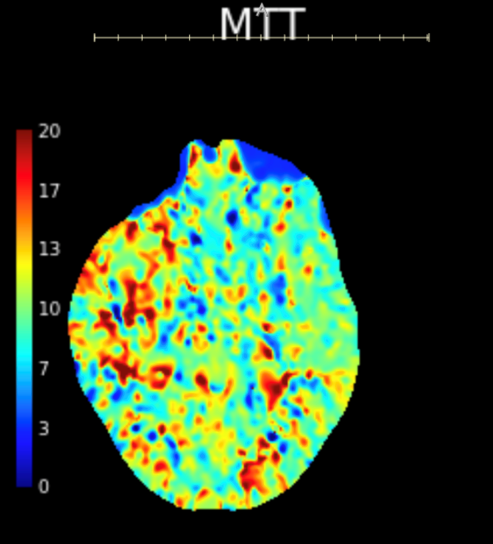Figure 3: CT perfusion brain showing prolonged mean transit time in the right MCA distribution compared to the left MCA.