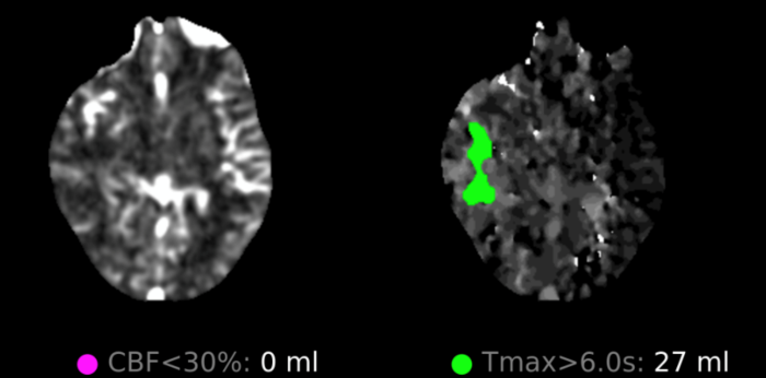 Figure 4: CT perfusion brain showing calculated 27 ml area of critical hypoperfusion with >6 seconds time-to-maximum filling.