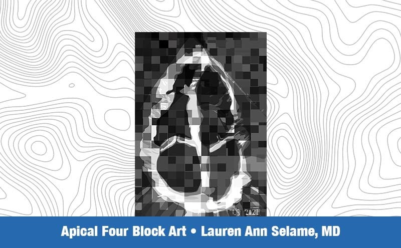 Artists Among Us: ACEP's 2021 Annual Report features original art submitted to the 2020 and 2021 HeART of Emergency Medicine Galleries. This photo, “Apical Four Block Art” by Lauren Ann Selame, MD, depicts a standard cardiac ultrasound view, the apical four chamber view. Dr. Selame said: "Recognizable as a heart to many clinicians, others may find abstraction and creatures. In medicine we examine, fix, optimize, and finally surrender to this organ. In life, it guides and mystifies." Medium: Digital Art