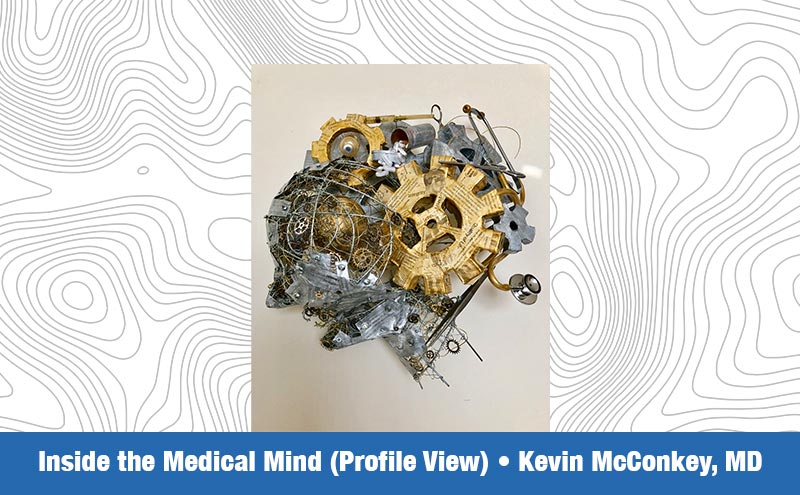 Artists Among Us: ACEP's 2021 Annual Report features original art submitted to the 2020 and 2021 HeART of Emergency Medicine Galleries. This piece, Inside the Medical Mind" by Kevin McConkey, MD, depicts "the challenging journey to become a physician leaves many feeling like a machine, a cog-in-the-wheel of our healthcare system. This sculpture explores the complexity of a physician’s psyche, including our academic beginnings, acquired procedural skillsets, and incorporates the ethics of our integrity, compassion, burnout, quality of life, wellness, and perspective."