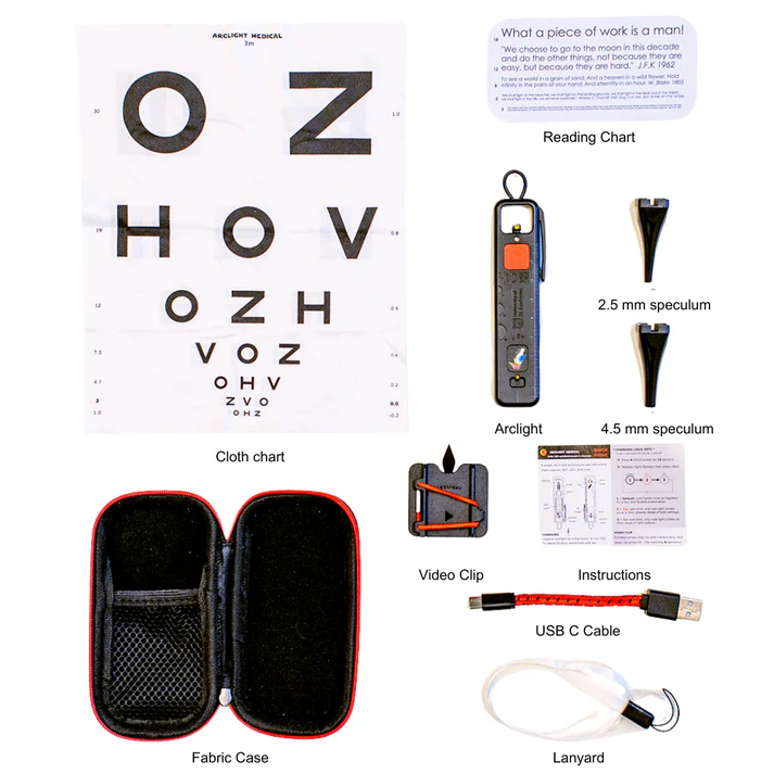 The Arclight is a novel, compact combination Loupe-Ophthalmoscope-Otoscope developed by St. Andrews Medical Innovations, a subsidiary of the University of St Andrews in Scotland. This diagnostic set is a game-changer in both clinical and wilderness medicine due to its true portability without compromising functionality. Unlike traditional, bulkier diagnostic tools, the Arclight is designed to be lightweight and easily portable, making it ideal for use in diverse environments, including the Emergency Department and remote, resource-limited settings. Its LED illumination ensures bright and clear visualization of both the retina and ear canal. The blue light functions as a Woods Lamp and I added fluorescein test strips to my kit.
