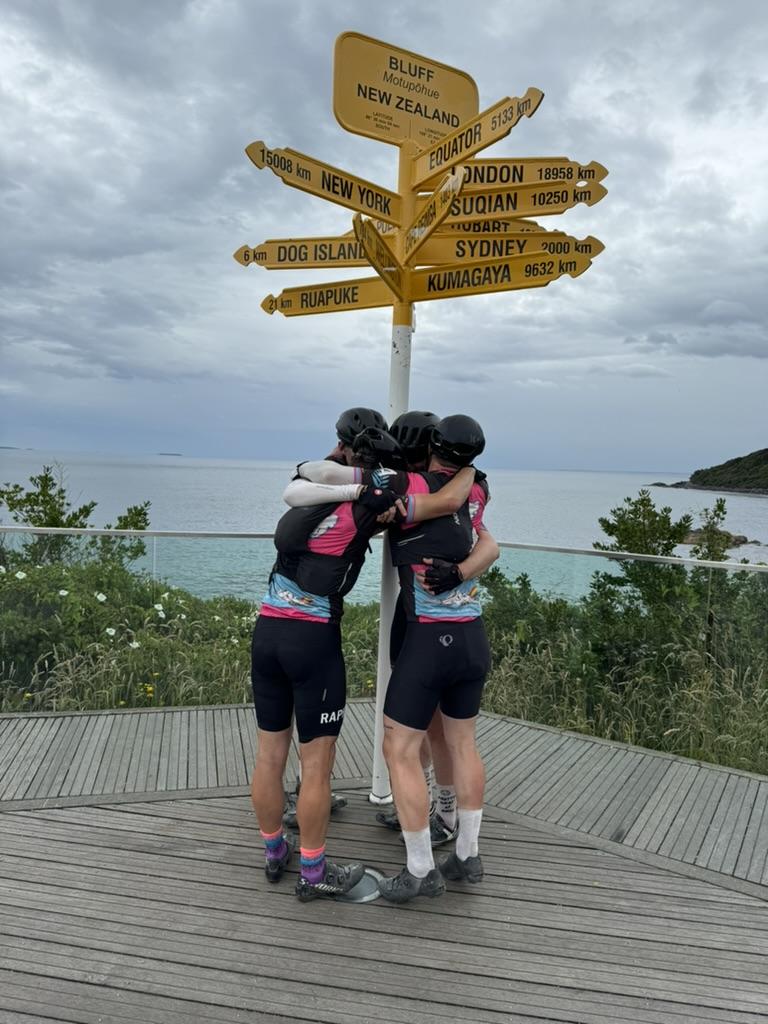Team celebrating expedition end at the southern tip of New Zealand. (David Young)