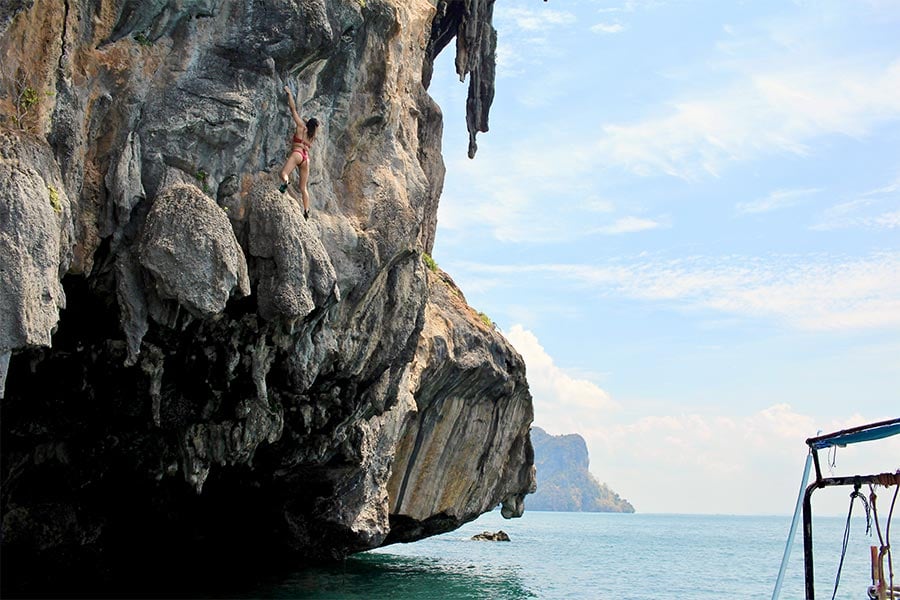 Deep water soloing off the coast of Krabi, Thailand. DWS is a form of free climbing that requires nothing more than shoes, chalk, and water for protection