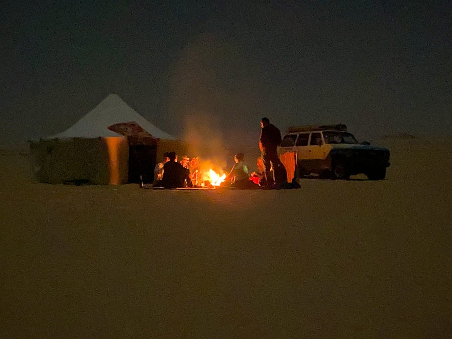Campfire illuminating tent, car, and large chalk rock formation at camp site in the remote White Desert National Park, Egypt