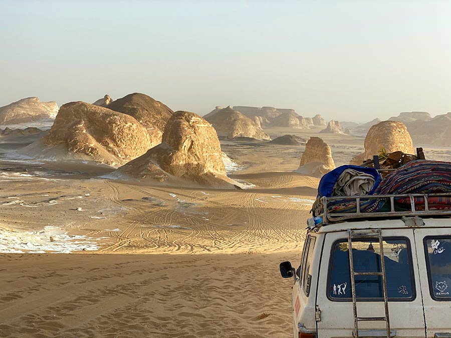 Pulling up to a valley of mushroom cliff formations in White Desert National Park